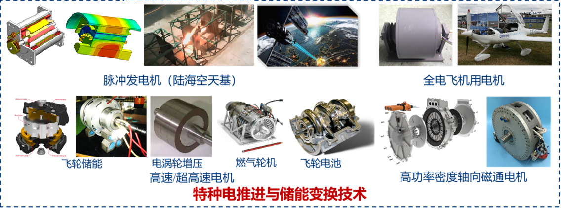 4. 特种电推进与储能变换技术:响应不同场景机电能量变换的特殊要求,开展高速/超高速电机系统、脉冲发电机系统、集成型电驱动系统、全电飞机用电机等方面的研究工作。