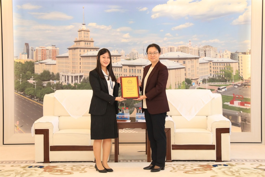 教育发展基金会副理事长孙雪分别向宗润福校友和沈阳芯源微电子设备股份有限公司颁发捐赠教育贡献奖奖牌和捐赠证书。