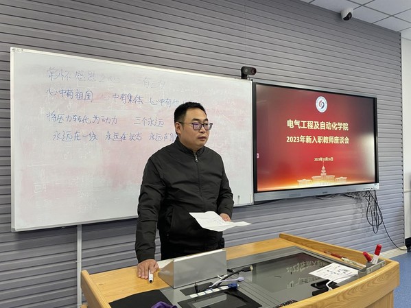 党委书记刘铭辉指出,为教师们办实事、解愁盼、促成长是学院服务体系建设的重要方面,欢迎教师们多提宝贵意见,学院将不遗余力解决教师们的科研和生活需求。并殷切叮嘱新教师,一是要树立远大志向,强化自身使命担当,科研上以国家需要为己任,勇担高水平科技自立自强排头兵,教学上以培养“四类人才”为目标,加强优质教育资源供给。二是要集中精力,加快自身角色转变,向名师学、向同行学、向同事学,善于总结创新,提升综合素质,争取早日成长为独当一面的科学家、教育家。三是要积极努力,主动担负各项职责任务,坚守立德树人根本任务,主动学习,积极作为,成长为“不负学生、不负家长、不负学校、不负社会”的“四有好老师”。四是要爱校爱院,成为强院强校的奋斗者,传承百年电气光荣传统,凝聚团队精神和力量,升华育人情怀。