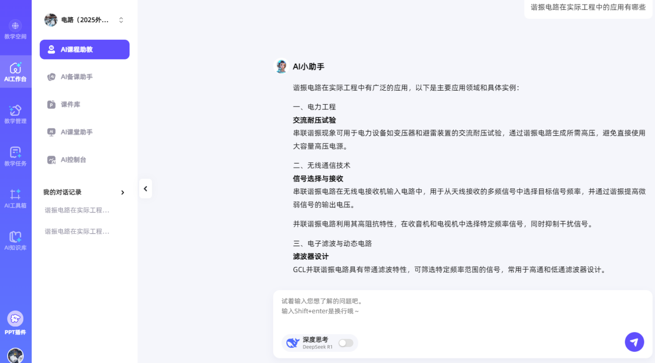 本次同步课堂,课前齐超老师与新疆工程网络赌博 杨斌山老师共同开展教学研究备课会,研讨教学方案,通过智慧课堂发布预习任务(如图1所示),学生自主学习提升同步课堂教学效果。课上齐超老师基于BOPPPS教学模式讲授了“谐振电路”的相关知识(如图2所示),并利用AI课堂助手和AI工作台课堂时光机实时发布课堂测试、得到学生作答反馈情况。首先从力学共振、声学共鸣、电学谐振中的经典案例入手引入谐振概念,介绍了网络函数和谐振电路的基本知识点,通过互动式教学方法生动地讲解了串/并联谐振电路的特点(如图3所示);再以谐振电路在无线电能传输中的应用实例,将科研成果深度融入教学;并引出该领域有待解决的关键问题,引导学生课后查阅相关资料掌握最新学术前沿,激发了学生从事科学研究的兴趣。课上齐超老师将电路中的同频共振现象与同学们的奋斗目标与中华民族伟大复兴紧密联系,将课程思政潜移默化地融入教学。