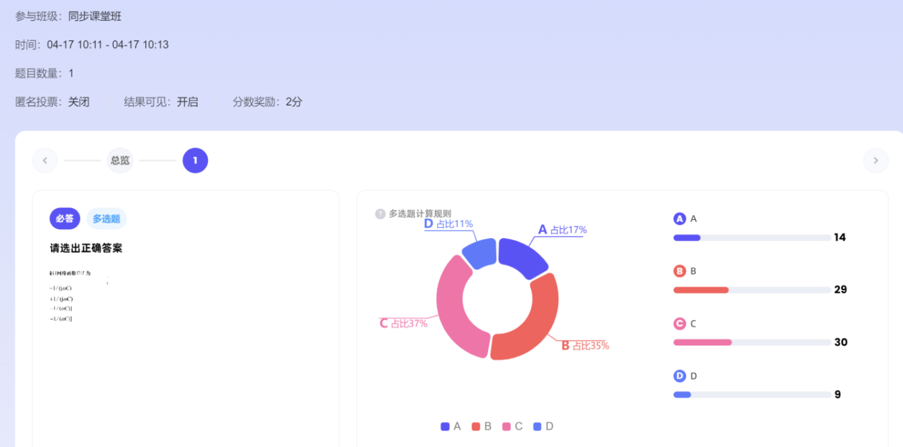 本次课程基于AI智慧课程,融入AI助手、AI资源等人工智能技术,实现了AI赋能翻转课堂。借助AI课程助教输入学生希望了解的问题,比如谐振电路在实际工程中的主要应用领域和具体实例等(如图5所示),便于学生能够将理论知识和实际工程应用紧密结合;教学过程中利用AI课堂助手/灵动课堂发布前测和后测习题(如图6所示),通过AI工作台课堂时光机反馈得到学生作答情况(如图7所示),便于实时掌握学生对相关知识点的掌握情况,进行教学的动态调整。